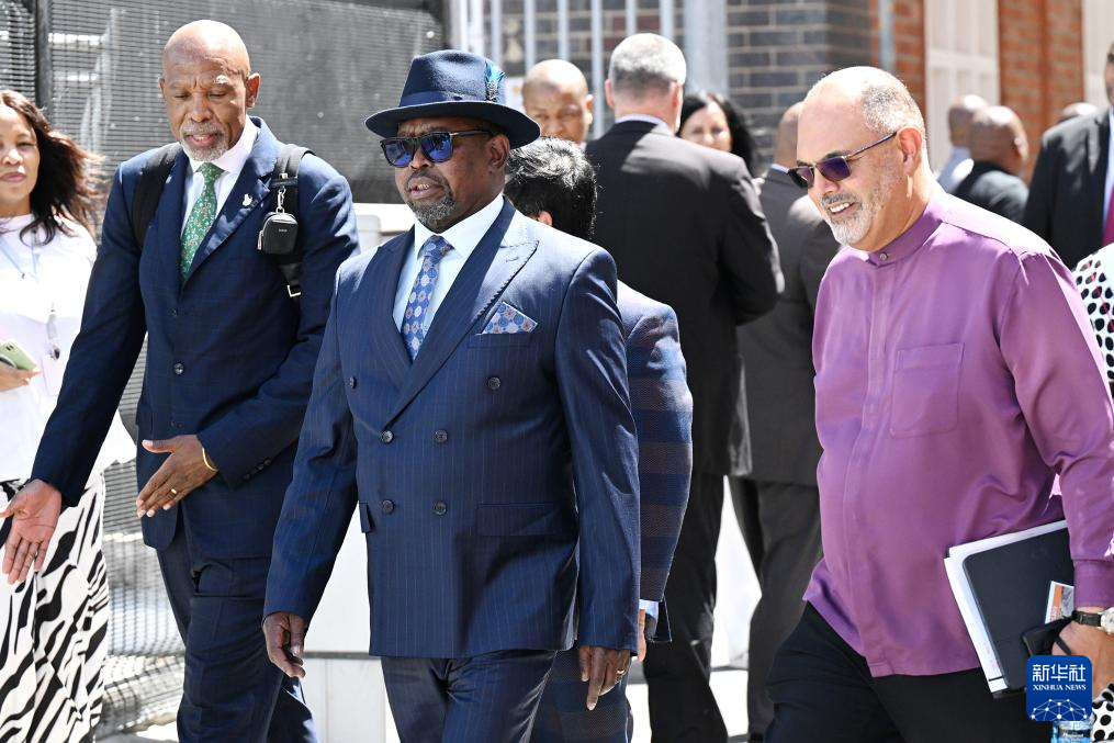 这是2月25日南非财政部长埃诺赫·戈东瓜纳(前中)在开普敦准备出席南非议会会议的资料照片。