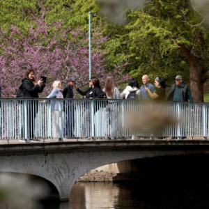 4月14日,人们在英国伦敦圣詹姆斯公园内行走。