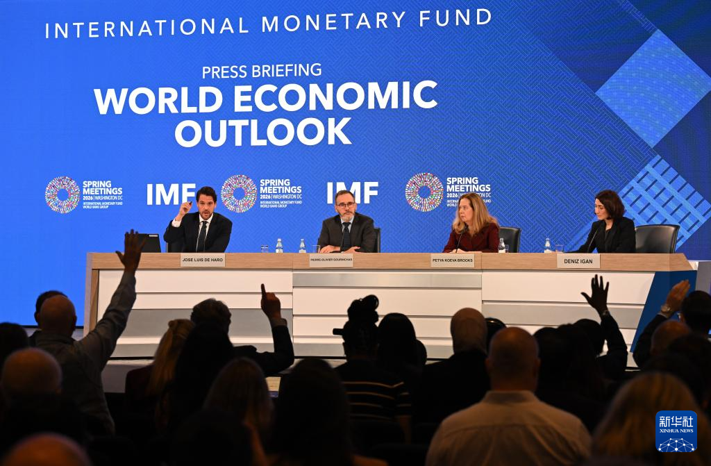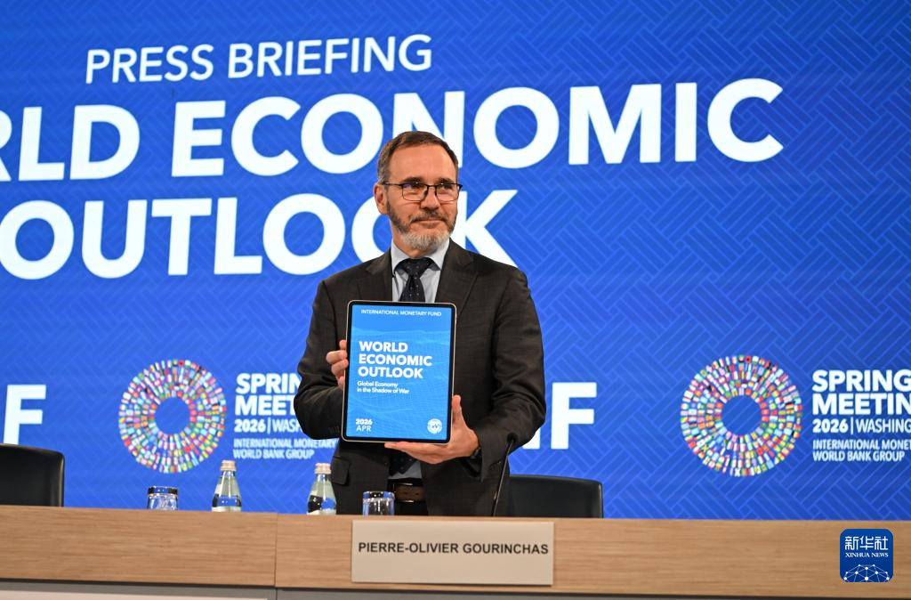 4月14日,在美国华盛顿,国际货币基金组织首席经济学家皮埃尔-奥利维耶·古兰沙(中)出席最新一期《世界经济展望报告》的新闻发布会。