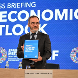 4月14日,在美国华盛顿,国际货币基金组织首席经济学家皮埃尔-奥利维耶·古兰沙在最新一期《世界经济展望报告》的新闻发布会上展示报告。