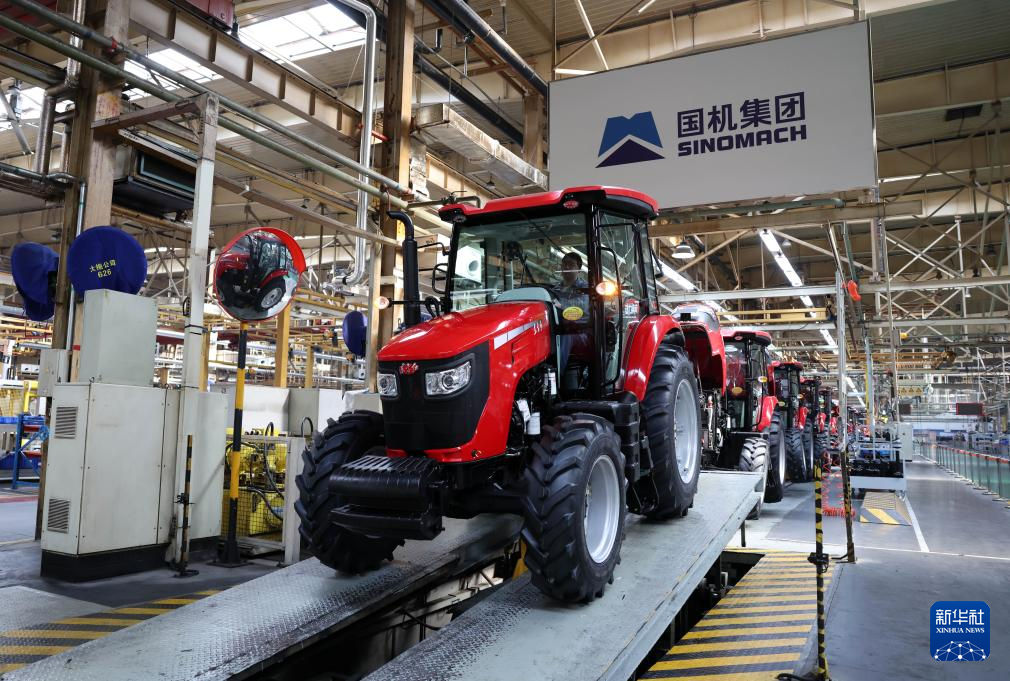 工人在位于河南洛阳的国机集团中国一拖大轮拖总装线作业(2026年4月14日摄)。