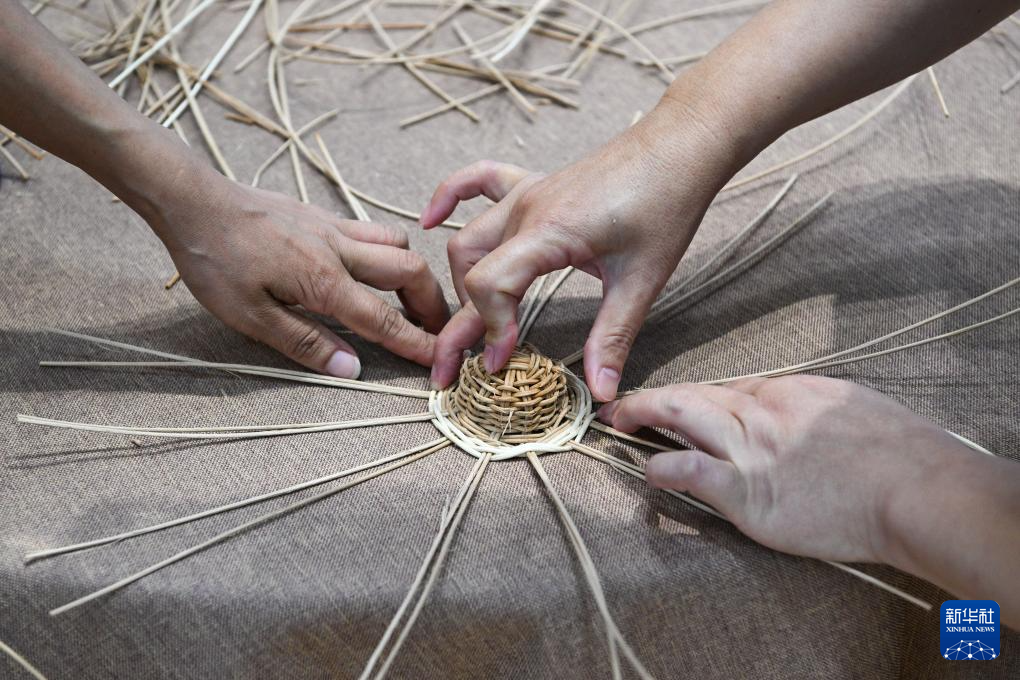 4月15日,在第六届消博会国潮出海展区,人们在体验非遗藤条编织。