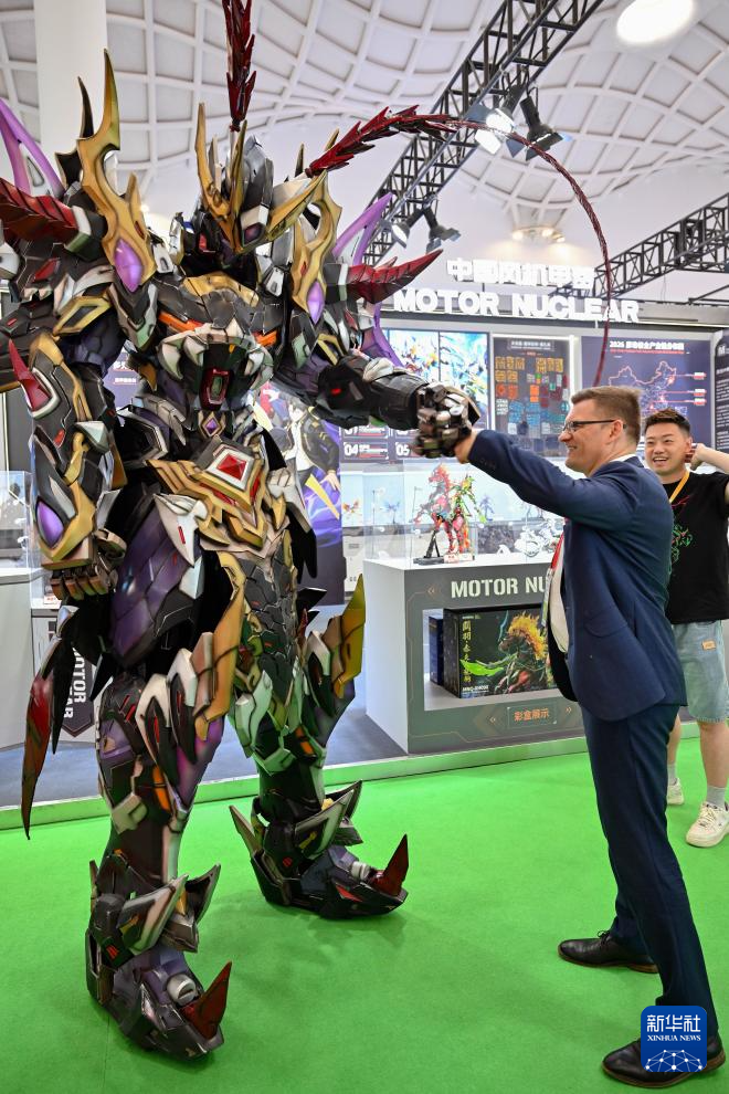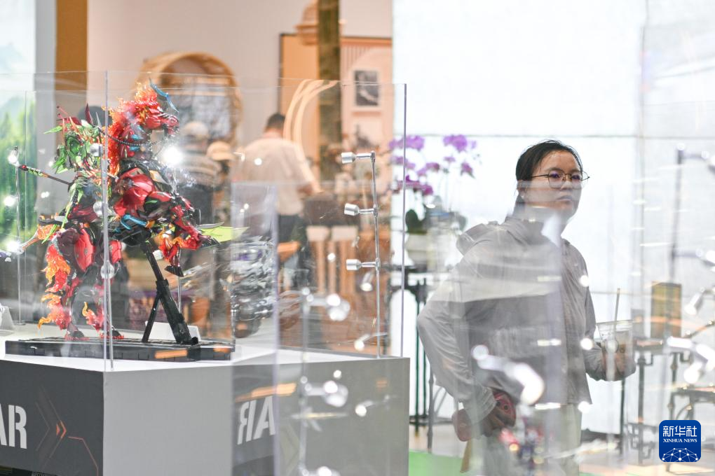 4月15日,在第六届消博会国潮出海展区摩动核展台,观众经过一款国风机甲模玩。