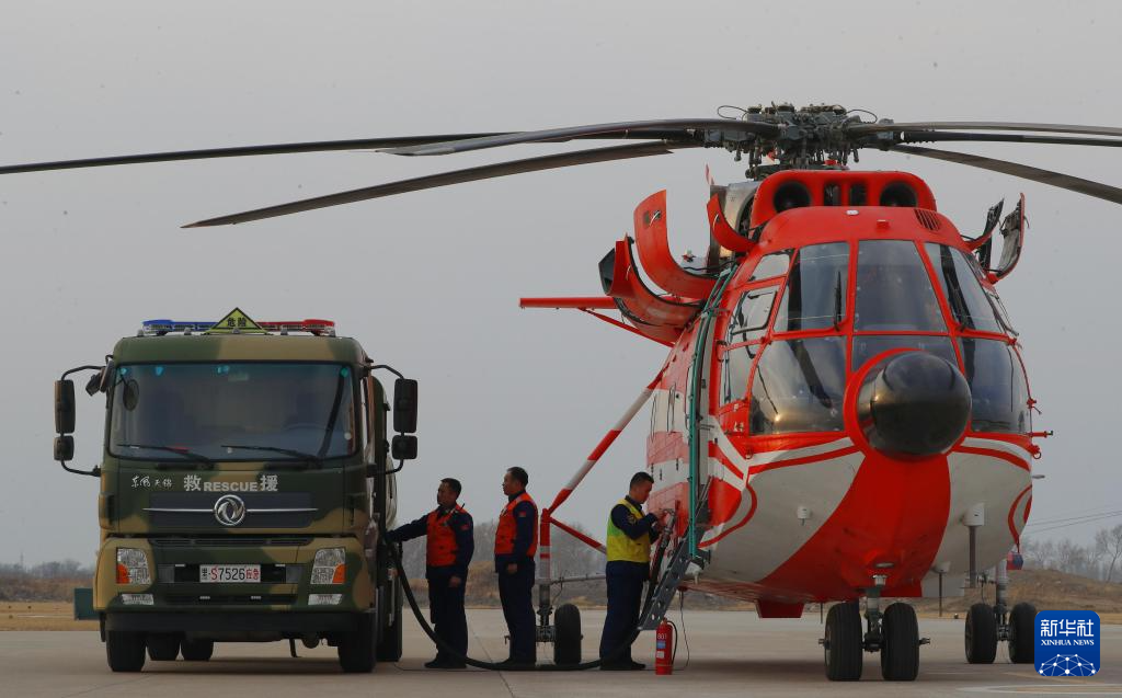 4月15日,在位于黑龙江省大庆市的国家消防救援局大庆航空救援支队跨昼夜救援演练现场,地面保障人员为直升机加注燃油。