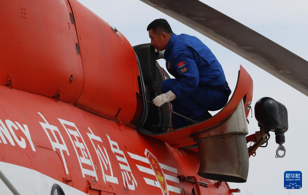 4月15日,在位于黑龙江省大庆市的国家消防救援局大庆航空救援支队跨昼夜救援演练现场,机务保障人员在夜间飞行演练前检查直升机。