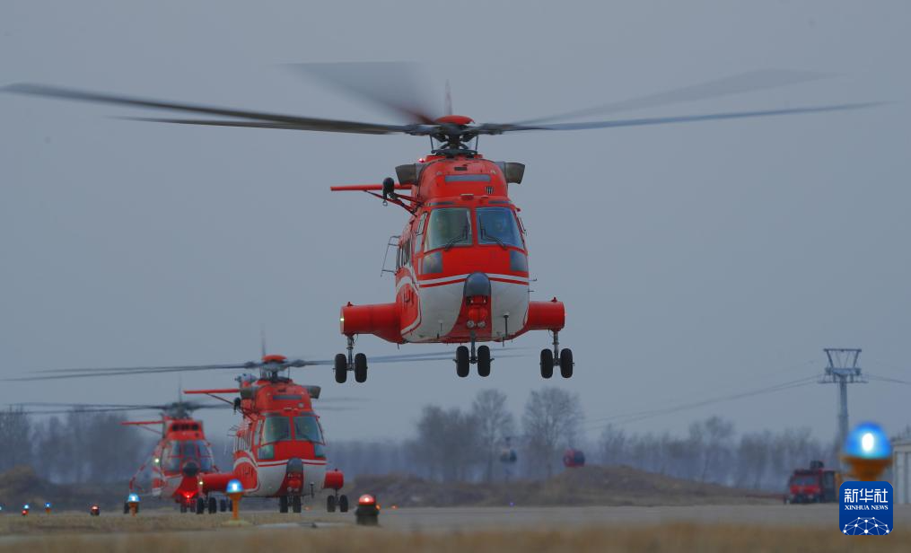 4月15日,国家消防救援局大庆航空救援支队多架救援直升机在黑龙江省大庆市依次升空,围绕暗舱仪表进近、暗舱航行转场、起落航线等多个项目开展跨昼夜飞行演练,锤炼队伍全天候、全时段执行应急救援任务的本领。