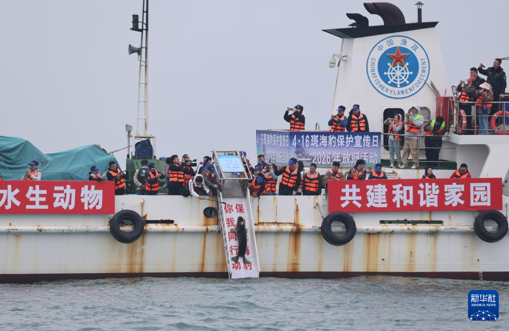 4月16日,工作人员将斑海豹放归大海。
