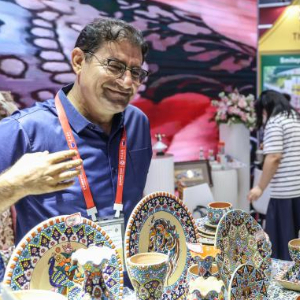 4月15日,观众在第六届消博会现场了解伊朗工艺品。