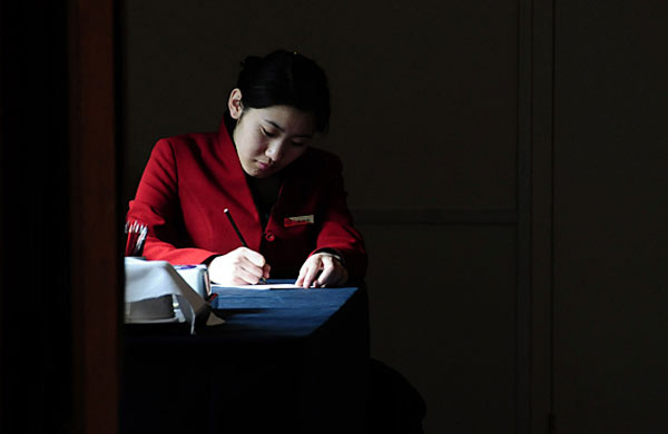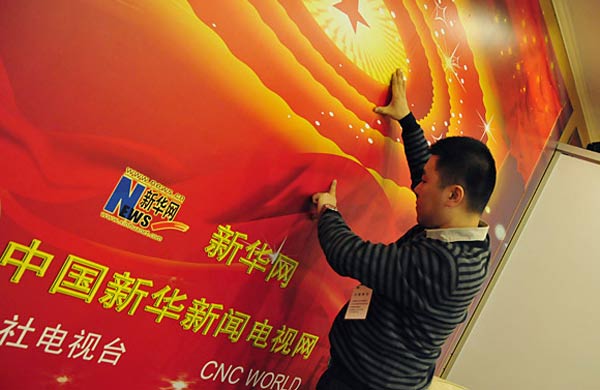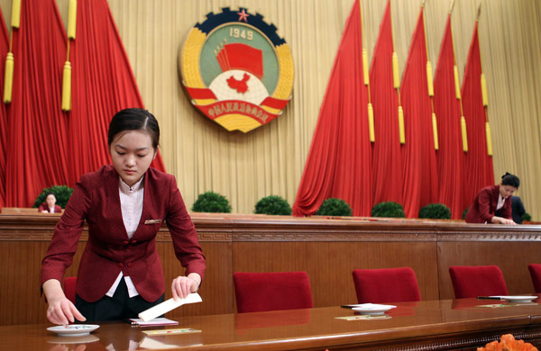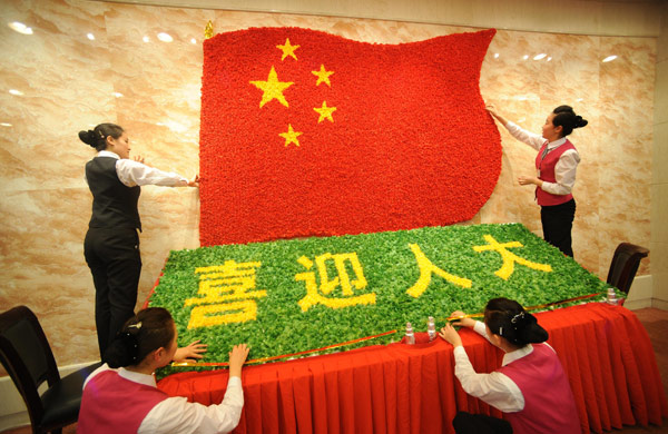 3月3日,人民大會(huì)堂的工作人員在布置會(huì)場(chǎng)。當(dāng)日15時(shí),中國(guó)人民政治協(xié)商會(huì)議第十一屆全國(guó)委員會(huì)第四次會(huì)議將在北京人民大會(huì)堂開幕。