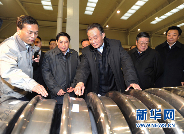 ????11月19日至23日,全國人大常委會委員長吳邦國在山西調研。這是11月20日,吳邦國在太原重工集團高速輪對國產化項目現場詳細了解工藝流程和技術指標。 新華社記者 李濤 攝