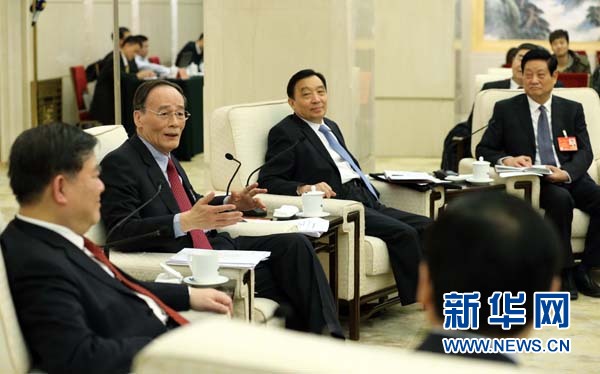 ??? 新華網北京3月9日電 中共中央政治局常委、中央紀委書記王岐山9日下午在十二屆全國人大二次會議陜西代表團參加審議。