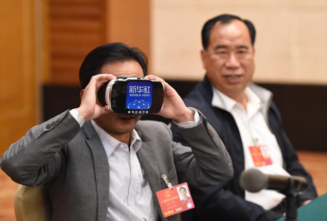 3月6日,代表們使用VR眼鏡觀看李松泉帶來(lái)的VR全景視頻。新華社記者楊宗友攝