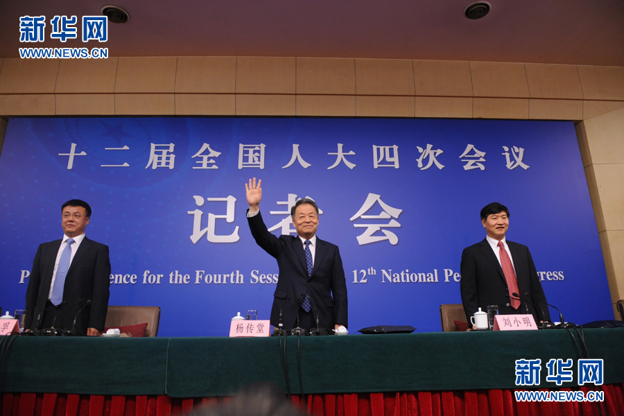十二屆全國人大四次會議新聞中心于3月14日(星期一)10時在梅地亞中心多功能廳舉行記者會,邀請交通運(yùn)輸部部長楊傳堂、交通運(yùn)輸部運(yùn)輸服務(wù)司司長劉小明、北京交通發(fā)展研究中心主任郭繼孚就“深化出租汽車改革與發(fā)展”的相關(guān)問題回答中外記者的提問。圖為楊傳堂、劉小明、郭繼孚到達(dá)會場,楊傳堂向記者揮手致意。新華網(wǎng)/中國政府網(wǎng) 陳杰 攝?