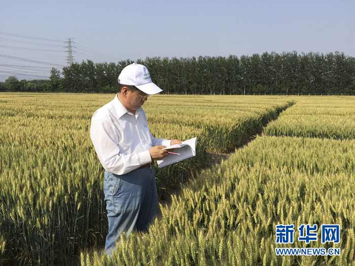 何中虎在中國(guó)農(nóng)業(yè)科學(xué)院昌平育種實(shí)驗(yàn)站觀察小麥新品種(資料照片)。新華社發(fā)