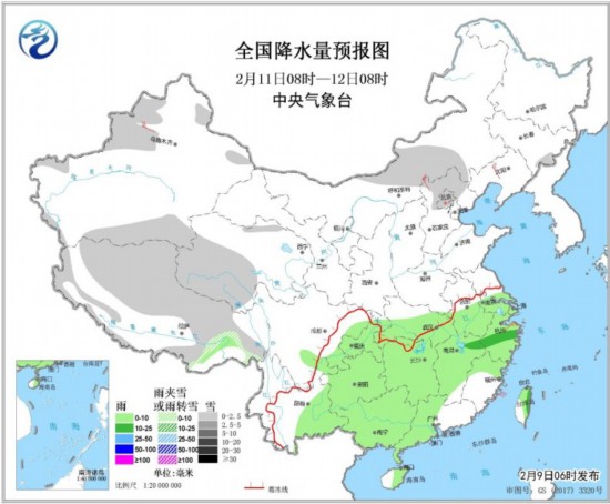 圖2 全國降水量預報圖(2月9日08時-10日08時)