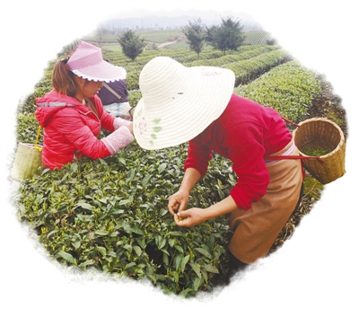 正值初春,茶海一股股綠色波浪間,采摘明前茶的身影漸漸多起來(lái)。走近些,只見茶農(nóng)兩手并用,上下翻騰,大拇指和食指準(zhǔn)確地將茶青捏住,用力一提,手腕一甩,鮮嫩的芽便收入了斜挎背的竹簍里。切不可用指甲掐,否則破壞了細(xì)胞結(jié)構(gòu),茶青是要變黑的。