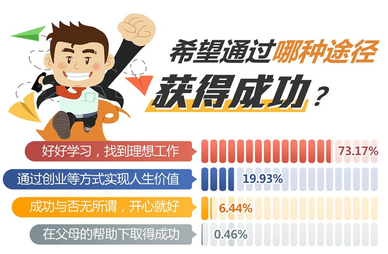 問(wèn)卷調(diào)查中,93.1%的受訪大學(xué)生希望通過(guò)“好好學(xué)習(xí),找到理想工作”和“通過(guò)創(chuàng)業(yè)等方式實(shí)現(xiàn)人生價(jià)值”兩種途徑獲得成功。