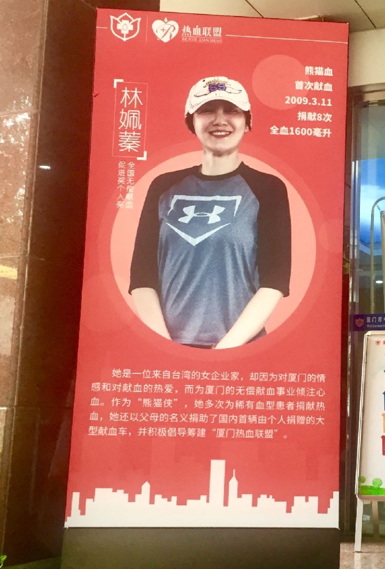 廈門市中心血站展板上宣介的是女臺商林姵蓁。她是Rh陰性血,這種血型因稀有而被稱為“熊貓血”。來自臺北的林姵蓁對無償獻血有一份執著和擔當,這源于父親獻血幾十次的身教。她志愿成為無償為他人捐獻“熊貓血”的“熊貓俠”,在臺灣每次接到求助電話都會第一時間趕去獻血。