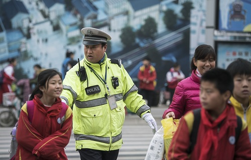 一位輔警在護送學生過馬路。陶明 攝