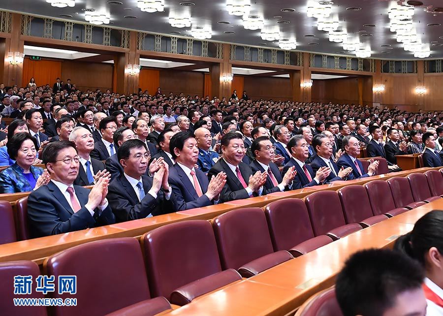 人民大會(huì)堂萬(wàn)人大禮堂處處歡聲笑語(yǔ)。二樓眺臺(tái)的橫幅格外醒目:緊密團(tuán)結(jié)在以習(xí)近平同志為核心的黨中央周圍,不忘初心、牢記使命,奮力奪取新時(shí)代中國(guó)特色社會(huì)主義偉大勝利!大會(huì)堂天幕上,投映著姹紫嫣紅的鮮花圖案,營(yíng)造出熱烈喜慶的氣氛。兩面紅旗造型的舞臺(tái)墻矗立在臺(tái)口,36名儀仗兵分列兩側(cè)。