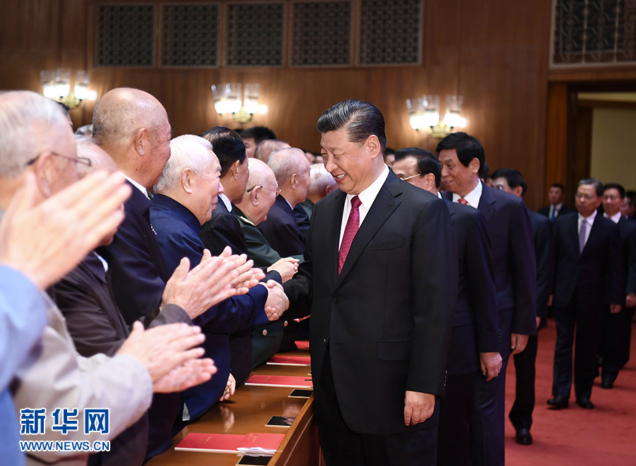 19時(shí)55分,在歡快的樂(lè)曲聲中,習(xí)近平等領(lǐng)導(dǎo)同志步入大禮堂,同老同志代表親切握手,向他們致以崇高敬意,全場(chǎng)響起熱烈掌聲。