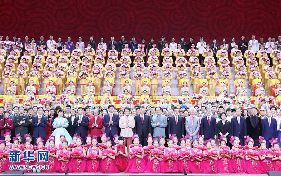 9月29日,慶祝中華人民共和國(guó)成立70周年大型文藝晚會(huì)《奮斗吧 中華兒女》在北京人民大會(huì)堂舉行。習(xí)近平、李克強(qiáng)、栗戰(zhàn)書、汪洋、王滬寧、趙樂(lè)際、韓正、王岐山等黨和國(guó)家領(lǐng)導(dǎo)人同4000多名觀眾一起觀看演出。演出結(jié)束后,習(xí)近平等走上舞臺(tái)同演職人員合影留念。 新華社記者 王曄 攝