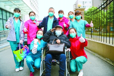 昨天上午,武漢協和醫院西院北京醫療隊負責的病區內,一名91歲的老兵孫爺爺康復出院,與平日里照料自己的醫護人員合影時,老兵敬了一個軍禮。記者 和冠欣攝