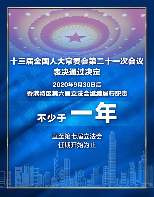 2020年9月30日后,香港特別行政區第六屆立法會繼續履行職責,不少于一年,直至香港特別行政區第七屆立法會任期開始為止。香港特別行政區第七屆立法會依法產生后,任期仍為四年。