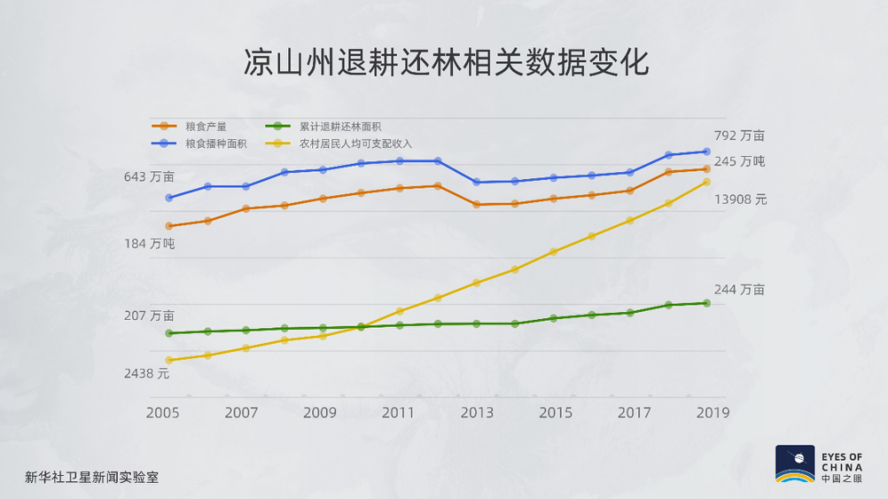 累計退耕還林超過243.8萬畝,衛星觀察到涼山植被的變化,反映出水土流失被控制、減緩以及扭轉的全過程,糧食年產量實現高達50%的增長。