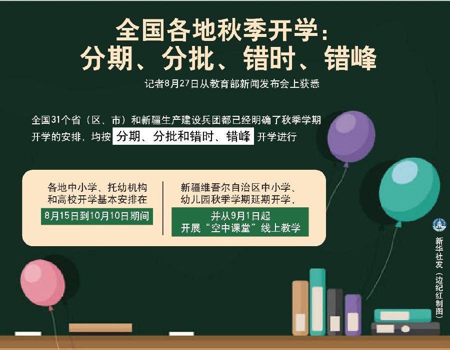 教育部應對新冠肺炎疫情工作領導小組辦公室主任、體育衛生與藝術教育司司長王登峰介紹說,各地中小學、托幼機構和高校開學基本安排在8月15日到10月10日期間。新疆維吾爾自治區中小學、幼兒園秋季學期延期開學,并從9月1日起開展“空中課堂”線上教學。