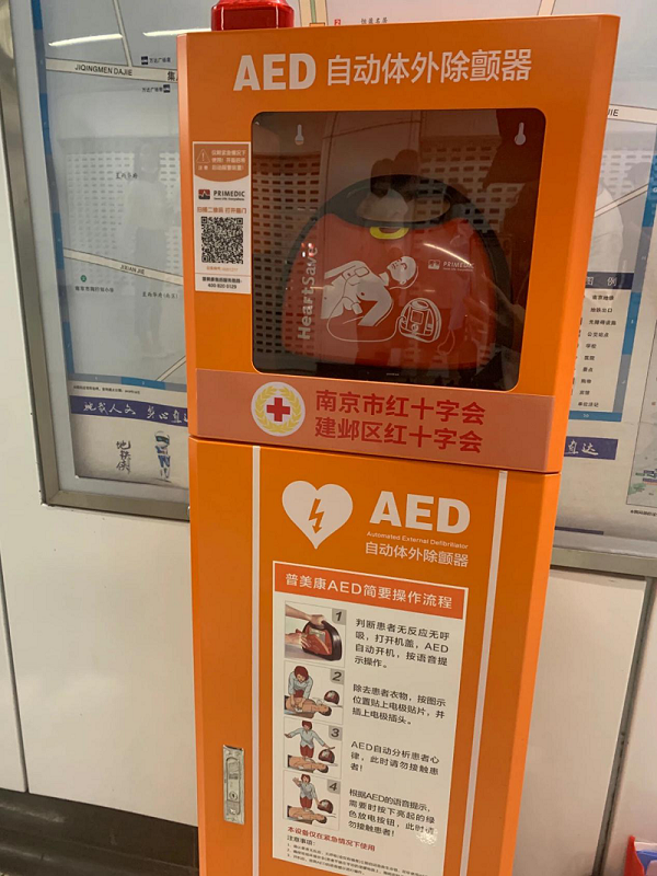 按照國際急救專家的共識,應(yīng)該每5公里配備一臺AED,也就是說在4分鐘以內(nèi)可以成功取到AED,并到達(dá)事發(fā)現(xiàn)場。在江蘇南京,所有的地鐵站點都已經(jīng)安裝了AED,南京率先在長三角地區(qū)實現(xiàn)了全覆蓋。