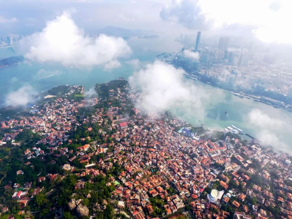2017年6月29日航拍的云層下的福建廈門鼓浪嶼民居。新華社記者 姜克紅 攝