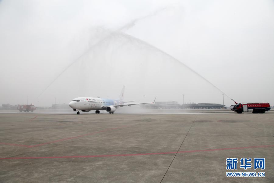 9月5日,中國(guó)國(guó)際航空公司冬奧主題彩繪飛機(jī)“冬奧冰雪號(hào)”在成都雙流機(jī)場(chǎng)正式亮相并參加“過(guò)水門(mén)”儀式。新華社發(fā)(中國(guó)國(guó)際航空公司西南分公司供圖)