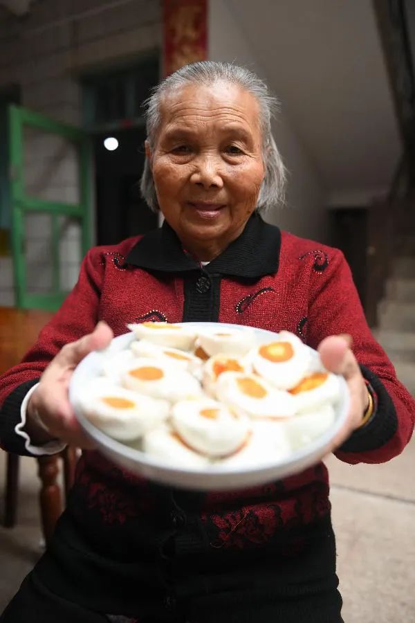 全國脫貧攻堅獎奮進獎獲得者廖秀英老奶奶在贛州瑞金市葉坪鄉鳳崗村家中向游客展示咸鴨蛋 劉青 攝