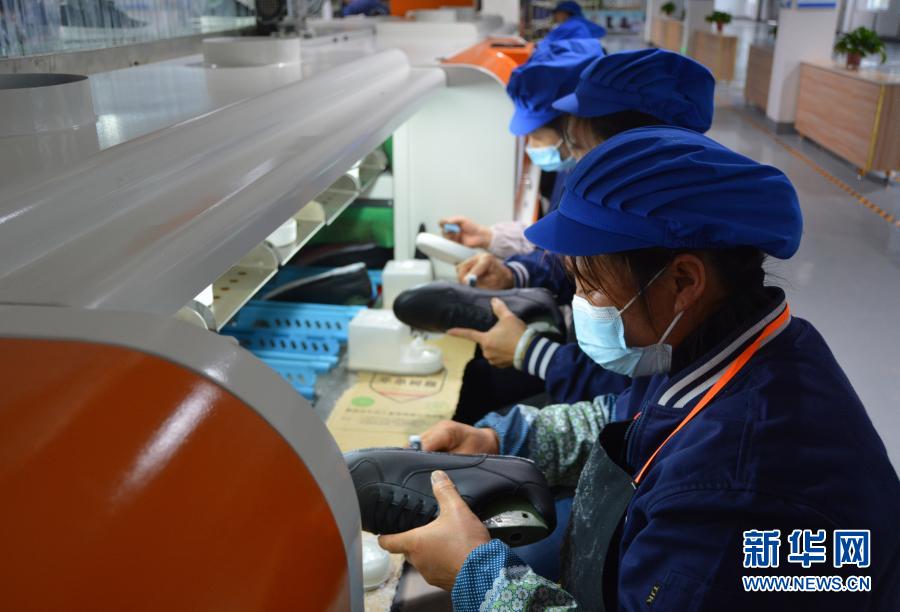 工人在廈琳鞋業產業園扶貧車間給成型鞋刷膠(12月1日攝)。新華社記者 顏之宏 攝