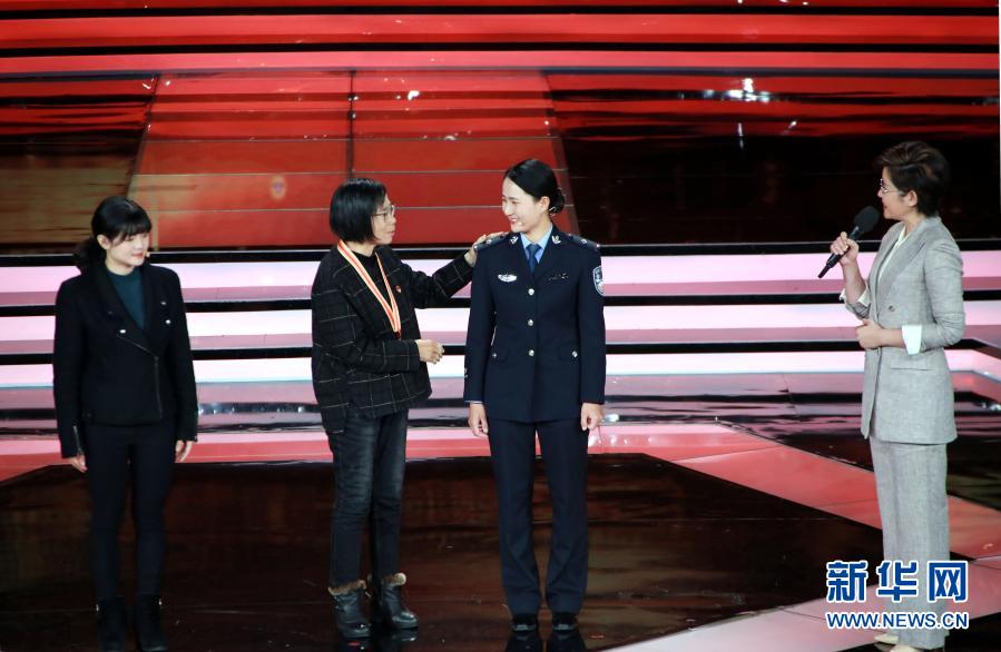 張桂梅(左)在“時代楷?!卑l布儀式上與主持人交流(12月7日攝)。新華社記者 潘旭 攝