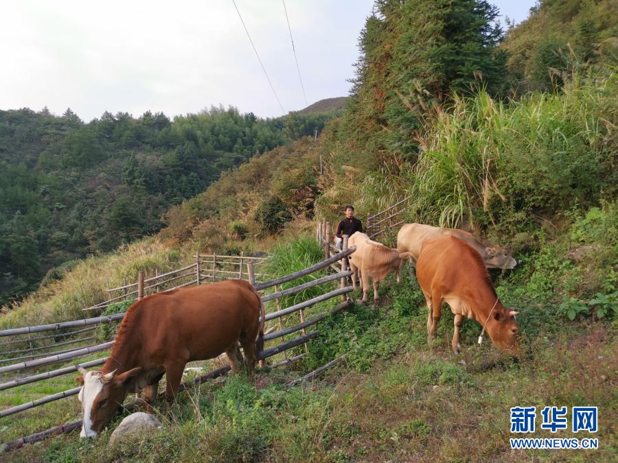 湖南省平江縣虹橋鎮(zhèn)大青石村村民李存泉在放牛(10月13日攝)。新華社記者 周楠 攝