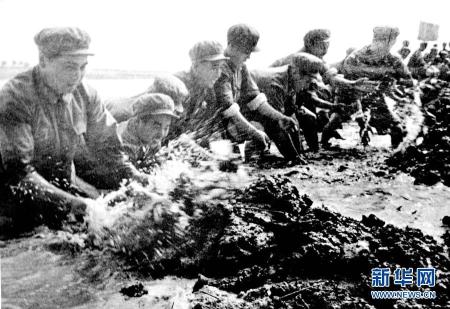 西昌衛星發射中心西昌發射場建設初期,老一輩航天人在安寧河中搶建長征橋(資料圖片)。新華社發