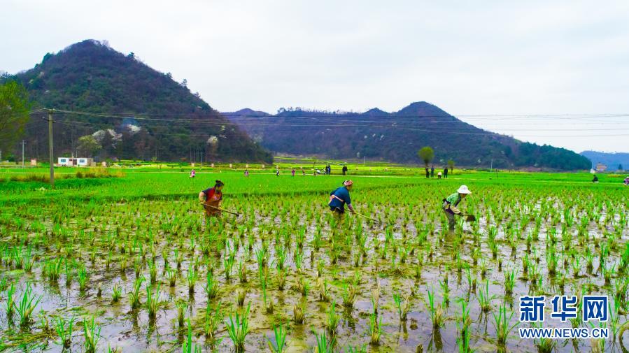 貴州省黔南布依族苗族自治州長順縣核子村村民在茭白地里松土(3月5日)。新華社發(fā)(蒯華揚 攝)