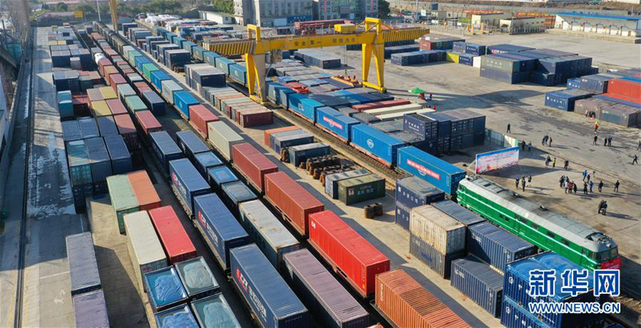 2月17日,中歐班列(南昌)在南昌向塘鐵路口岸等待發車(無人機照片)。 新華社記者 胡晨歡 攝