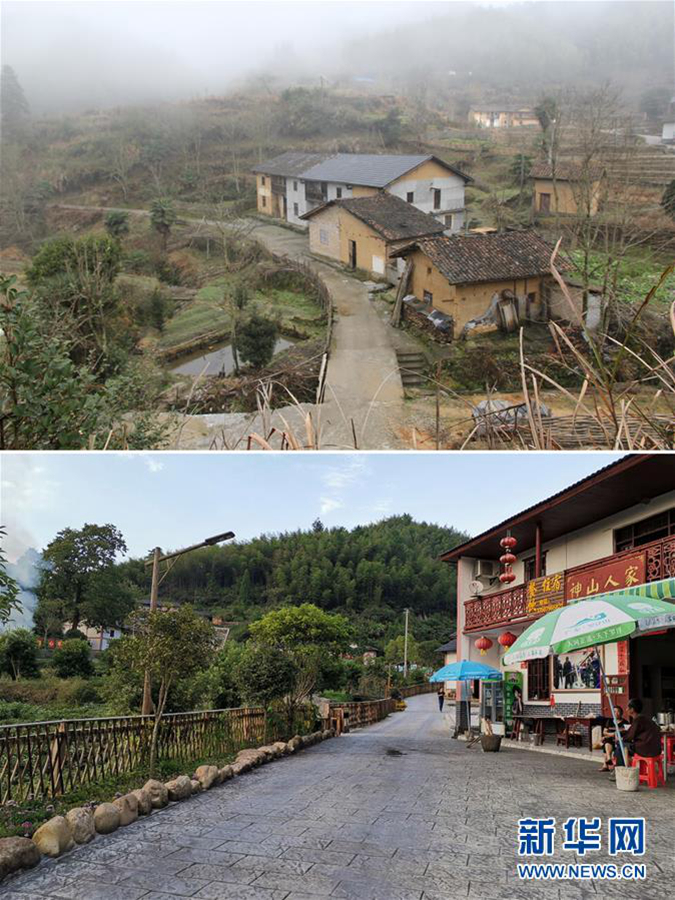 拼版照片:上圖為脫貧前的江西井岡山神山村一角(2016年1月攝);下圖為2019年9月拍攝的江西井岡山神山村一角。新華社發