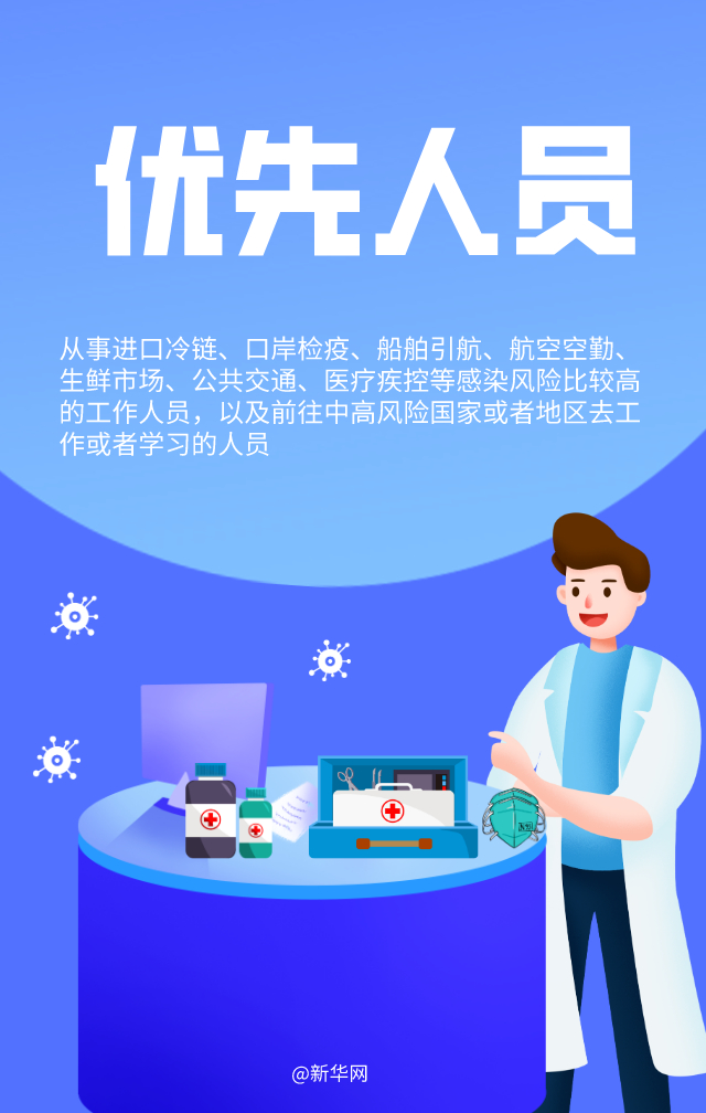 1月1日起,部分地區(qū)重點人群開始接種我國首批新冠病毒疫苗。哪些人員優(yōu)先接種?接種疫苗需要打幾針?哪些人不適合接種?接種疫苗后是否需要繼續(xù)戴口罩?十個關鍵詞帶你了解新冠病毒疫苗接種要點。