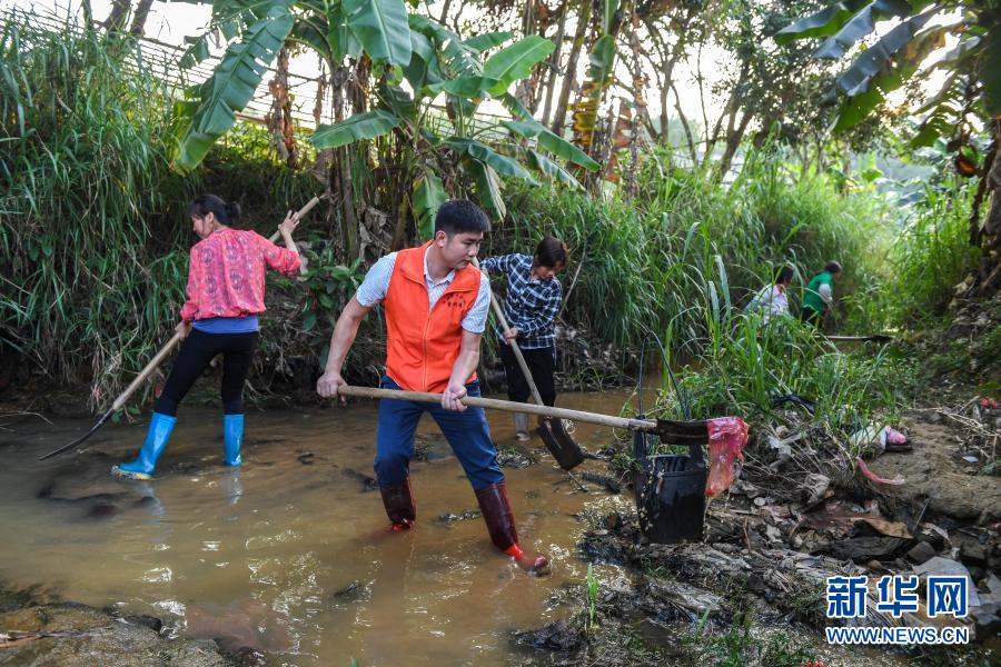 2020年5月2日,廣西興業縣小平山鎮金華村駐村第一書記董積有(左二)與村民一起清理河道中的淤泥和垃圾。新華社記者 曹祎銘 攝