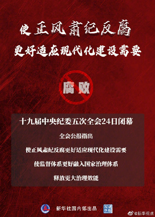 24日,十九屆中央紀委五次全會閉幕。全會公報指出:使正風肅紀反腐更好適應現代化建設需要,使監督體系更好融入國家治理體系,釋放更大治理效能。(記者:朱基釵、孫少龍;海報設計:朱舜)?