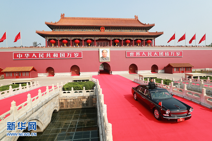 10月1日,慶祝中華人民共和國成立70周年大會在北京天安門廣場隆重舉行。中共中央總書記、國家主席、中央軍委主席習(xí)近平發(fā)表重要講話并檢閱受閱部隊。這是習(xí)近平乘坐檢閱車,經(jīng)過金水橋,駛上長安街。 新華社記者 龐興雷 攝