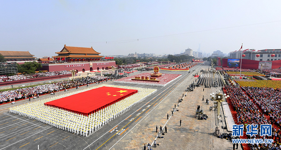 在陣陣歡呼聲中,由1949名青年組成的國(guó)旗方陣、2019名青年組成的國(guó)慶年號(hào)和國(guó)徽方陣依次走來(lái)。