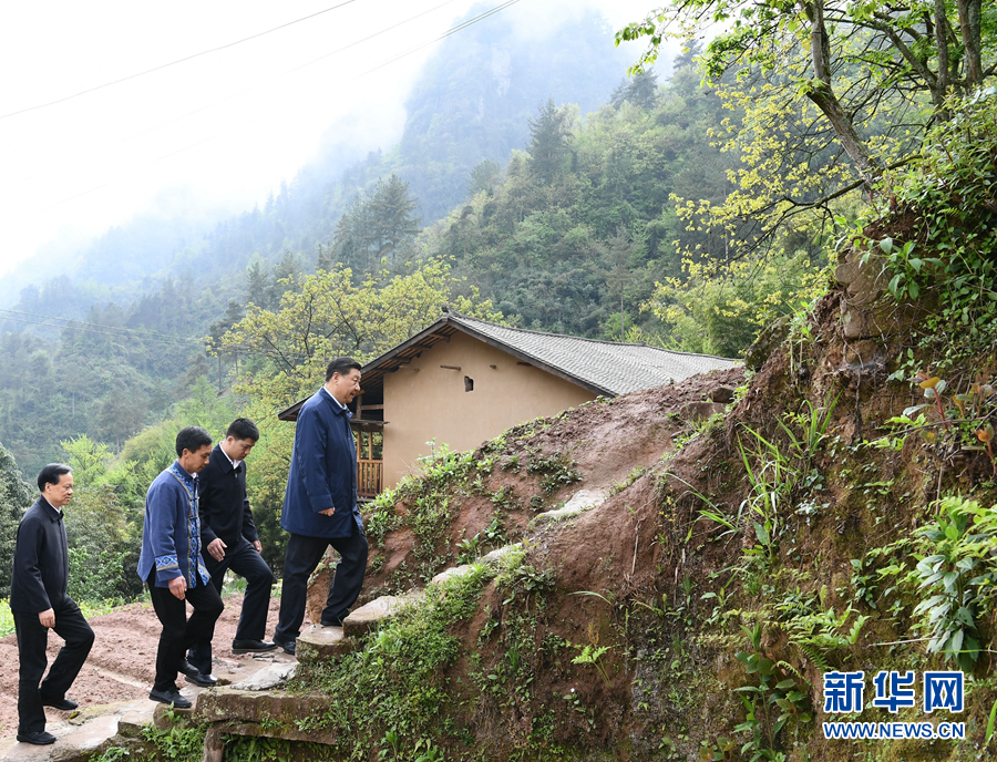 2019年4月15日至17日,習(xí)近平在重慶主持召開解決“兩不愁三保障”突出問題座談會(huì)。這是4月15日下午,在石柱土家族自治縣中益鄉(xiāng)華溪村,習(xí)近平踏著濕滑的上坡石階,前往貧困戶譚登周家看望。 新華社記者 謝環(huán)馳 攝