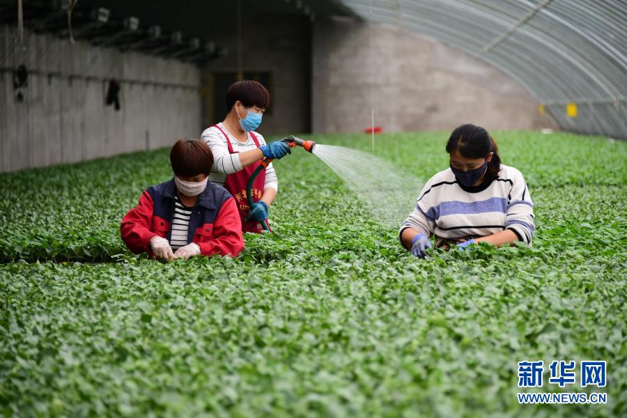 河北曲周縣一家育苗產業基地的工人在育苗溫棚內工作(5月4日攝)。曲周縣積極拓寬產業扶貧渠道,發揮當地產業優勢,統籌協調貧困戶利用扶貧資金入股現代設施農業基地,帶動群眾脫貧增收。新華社記者 朱旭東 攝