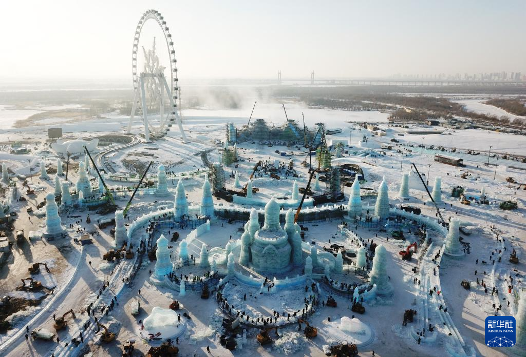 12月14日,工人在哈尔滨冰雪大世界园区建设现场施工(无人机照片)。