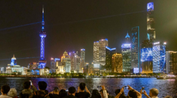 4月25日,工作人员在体验一件可以互动游戏的艺术作品《泡泡平衡》。